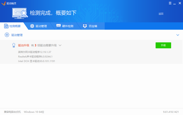 智能检测,连接驱动精灵我们可以对计算机具体配置状况,包括处理器、内存、主板、显卡、声卡、网卡等硬件信息一目了然。
