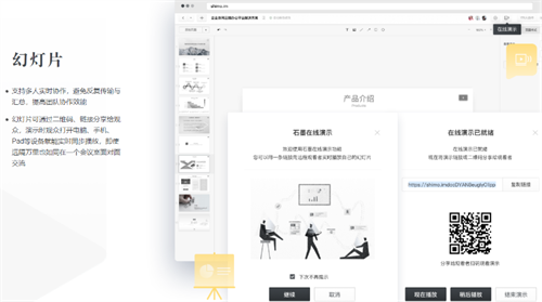 - 可通过二维码、链接分享给观众,演示时观众打开电脑、手机、pad等设备就能实时同步播放,即使远隔万里也如同在一个会议室面对面交流